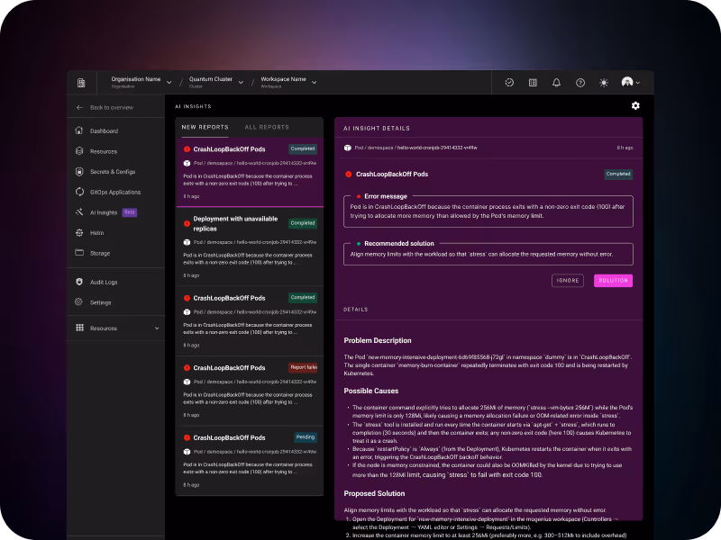 The Inbox for Cluster Health: AI Insights generates dedicated reports for failed deployments or crashing pods and sends them right into your mogenius Workspace.