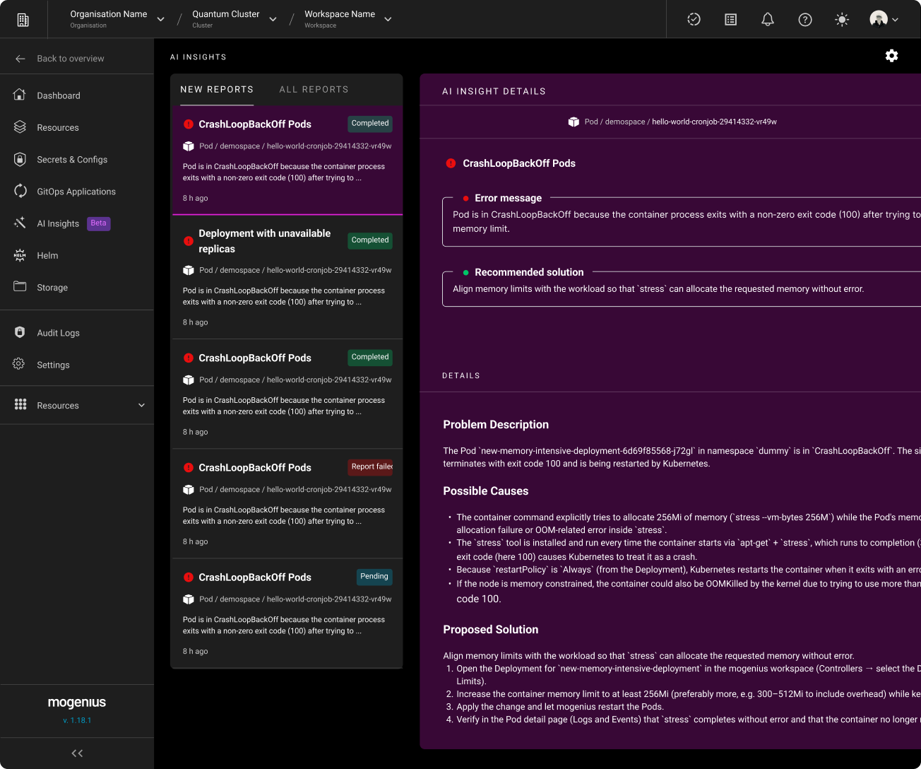 Most teams already have kubectl, metrics dashboards, logs, and Git history. What they lack is a shared, accessible understanding of how failures unfold across time and systems. AI Insights introduces a consolidated, context-aware analysis layer built on data collected by the mogenius operator. The goal is simple: reduce dependency on Kubernetes experts without reducing control.