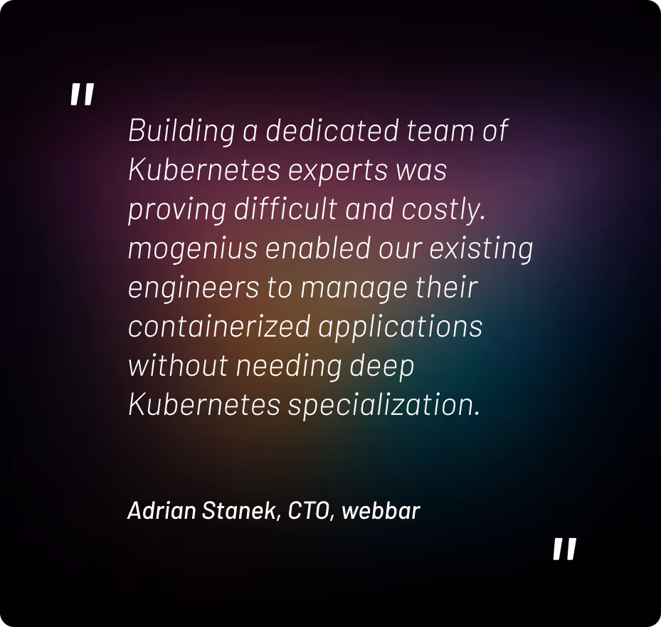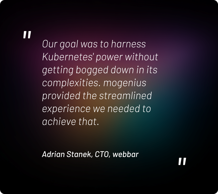 mogenius provided a solution that addressed webbar's skills shortage and non-functional requirements. mogenius delivered the internal developer platform (IDP) layer, allowing webbar to adopt a robust Kubernetes foundation without the inherent architectural and maintenance toil. The professional services team acted as the client’s extended platform team, accelerating the adoption of best practices.