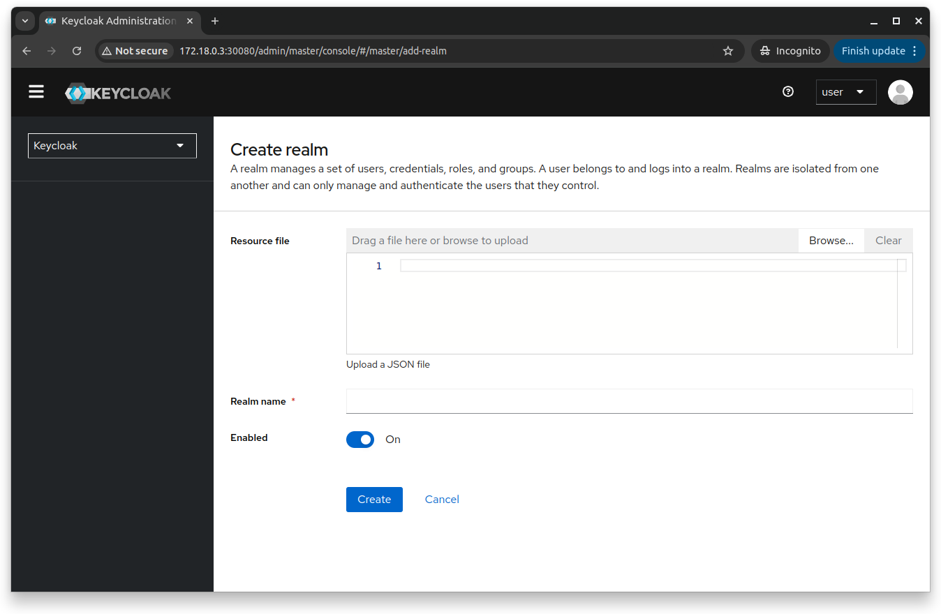 Use the URL provided in the output to access the Keycloak admin panel. The default admin username is user