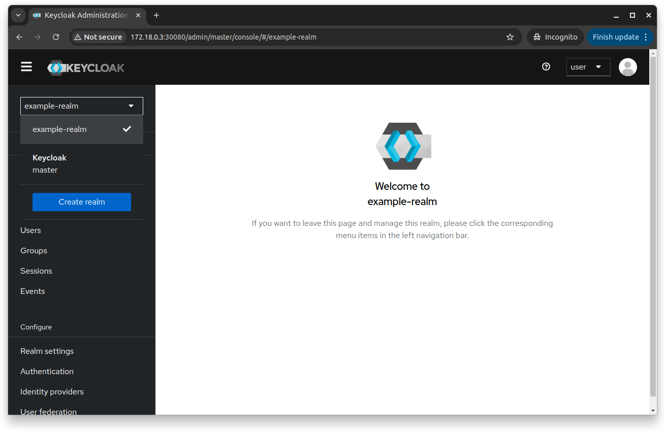 If you log in to the Keycloak admin console again and navigate to the realm dropdown at the top left, you'll see the newly created example-realm