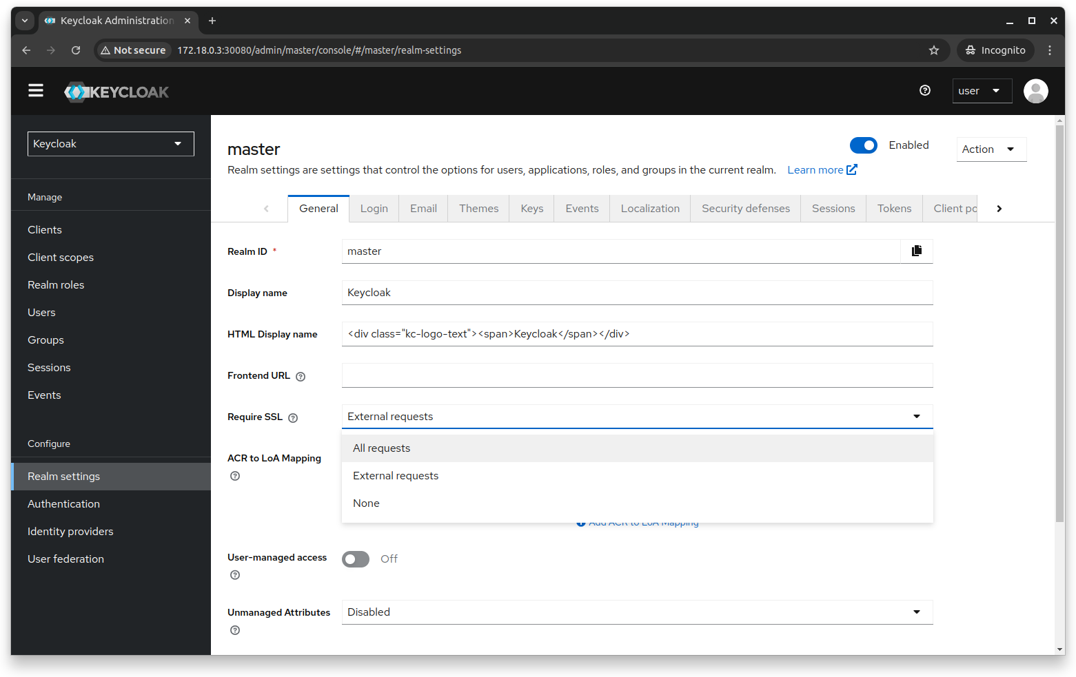You can enable SSL by navigating to Configure > Realm settings > General. The Require SSL dropdown shows three options allowing you to configure SSL based on where the requests are coming from.