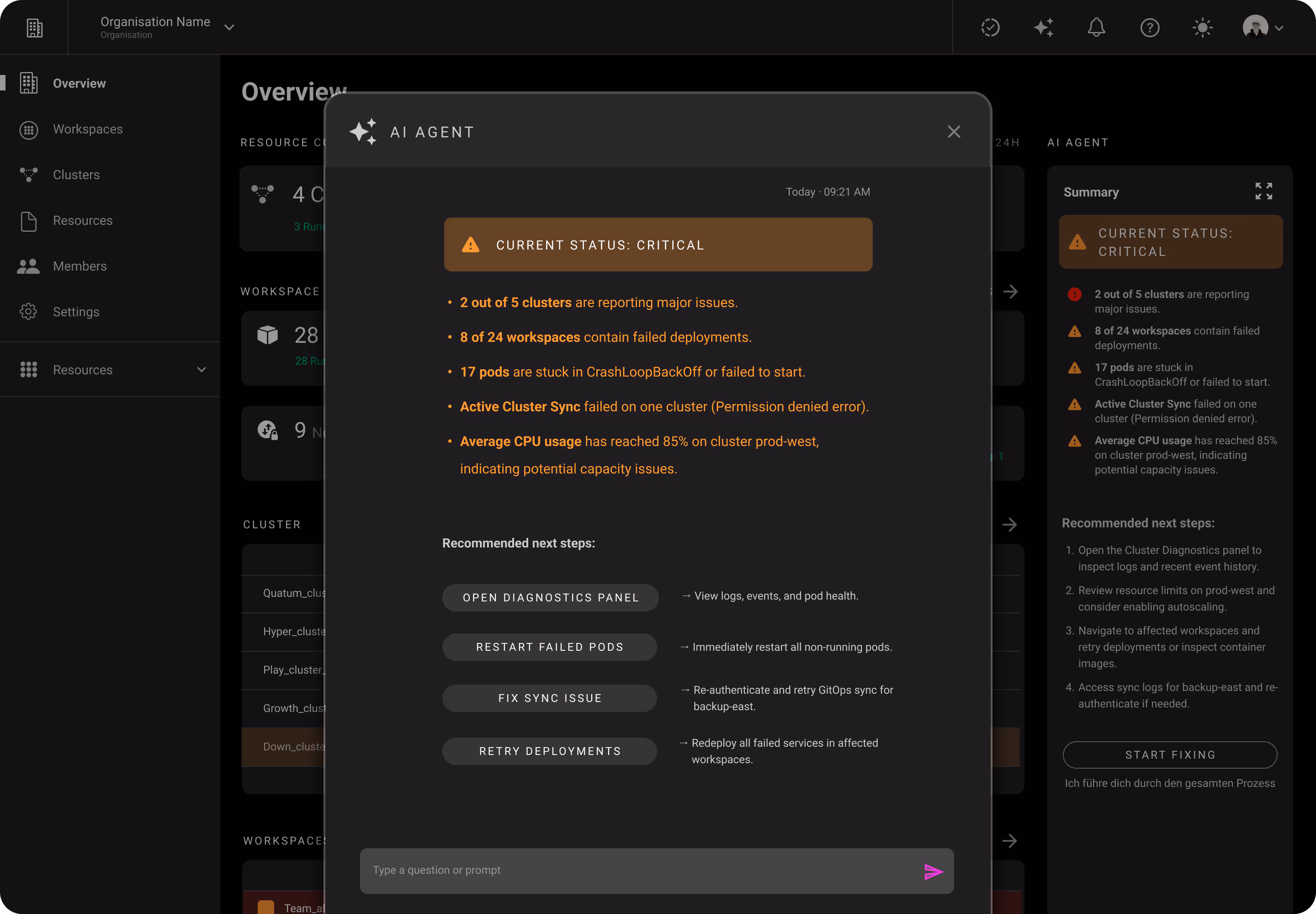 Connect and manage a fleet of clusters (cloud, on‑prem, edge) via the mogenius console.